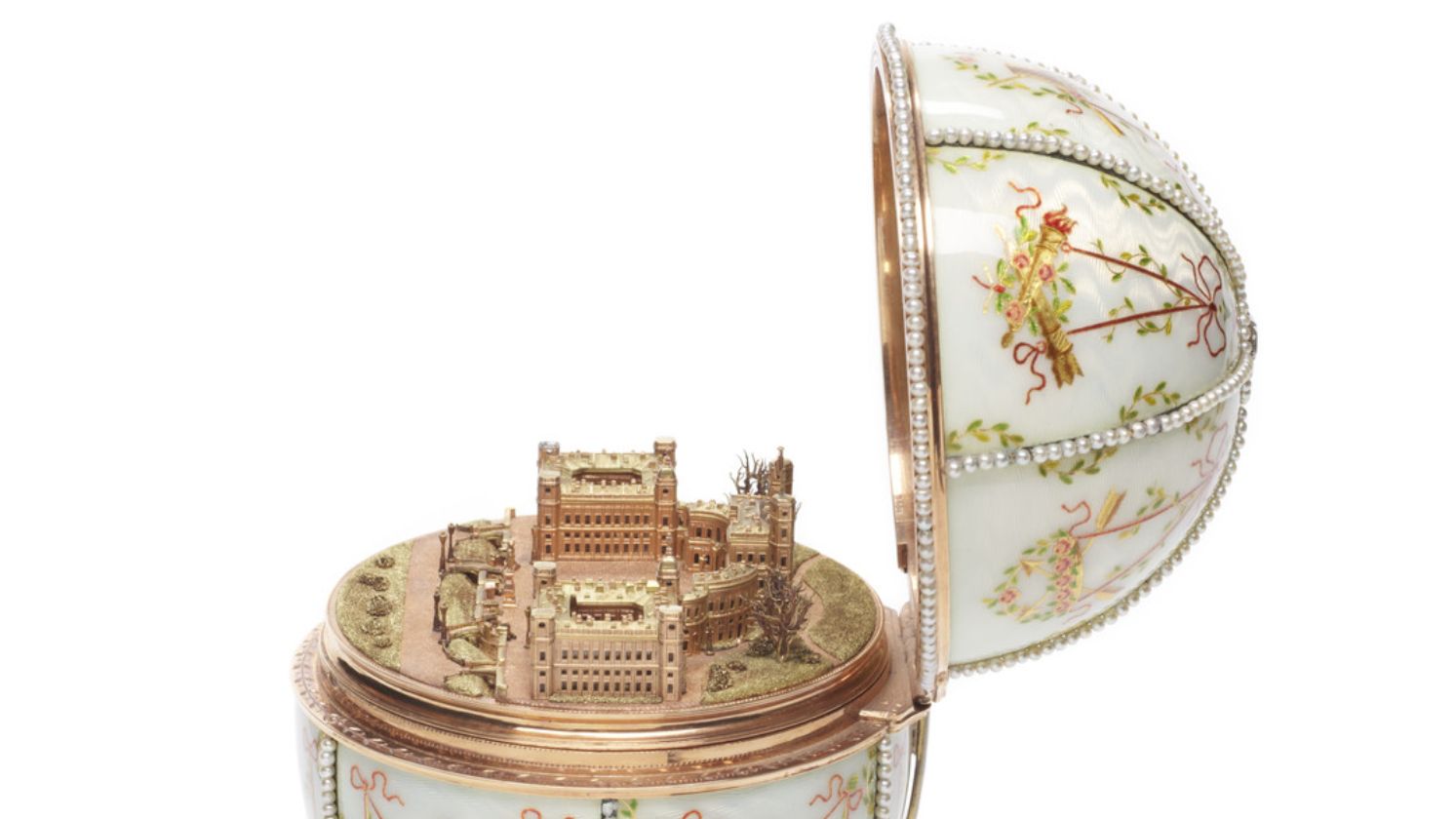 If you live in the South, you won't have to travel far to see this egg as it is on display in Houston. One of the most delicate examples of Fabergé craftsmanship, this egg features delicate bands of criss-crossing diamonds. The surprise, a wind-up ivory elephant, was rediscovered in 2015 after being lost for many years.